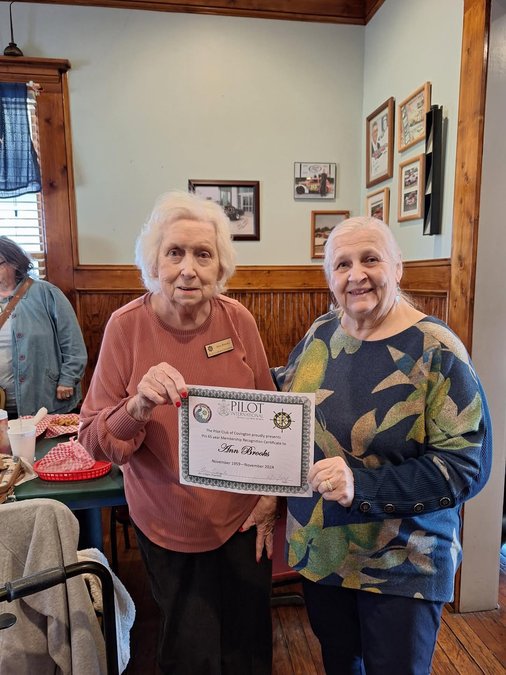 President Ann Cargile recognizied member Ann Brooks for 65 years with the Pilot Club of Covington.