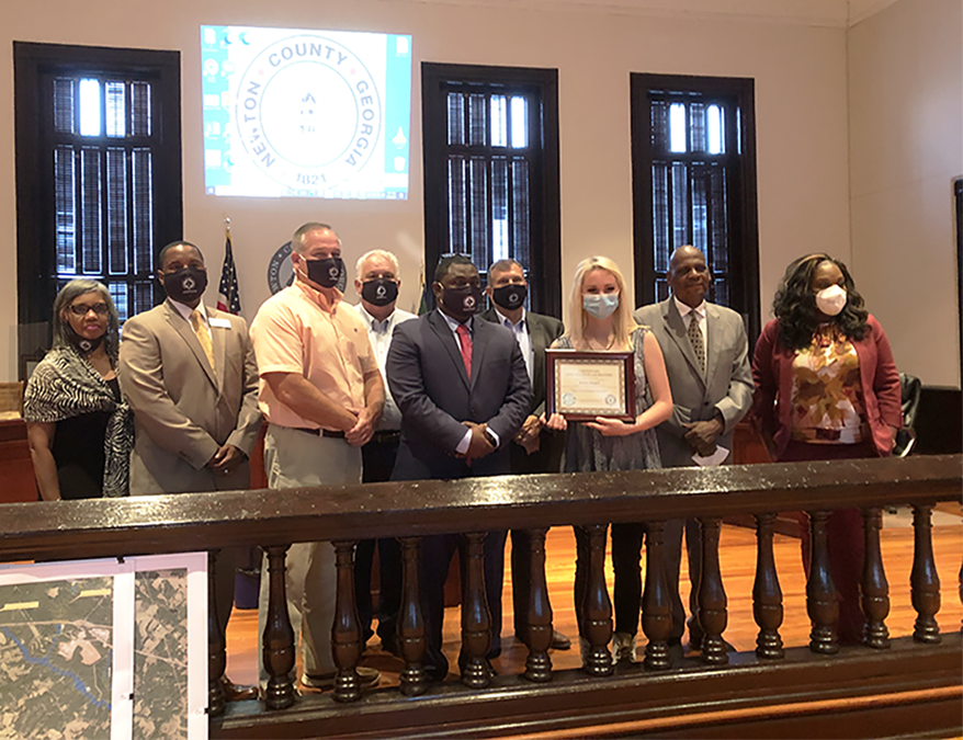 • Chairman Marcello Banes presented Covington resident Keelyn Harper with an award and commended her for “outstanding citizenship” in rescuing an entrapped and injured motorist from a burning vehicle that had wrecked on the side of County Road 213 on June 10.