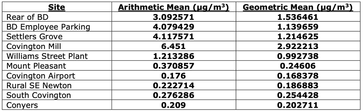 These data can be compared to the EPD South DeKalb Monitoring Site (0.144 μg/m3), which appears to be the most distant site from the BD facility and therefore something of a remote control.