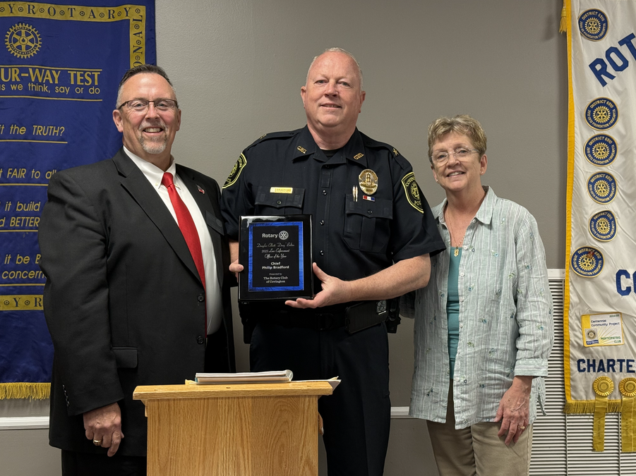 On Tuesday, the Rotary Club of Covington named Bradford – who did not officially enter retirement until this weekend – the inaugural Douglas Elliott “Doug” Bolton 2025 Law Enforcement Officer of the Year. The award was presented by Club Director Tommy Davis, President Tarrence Houston and Bolton’s late wife, Sherri.