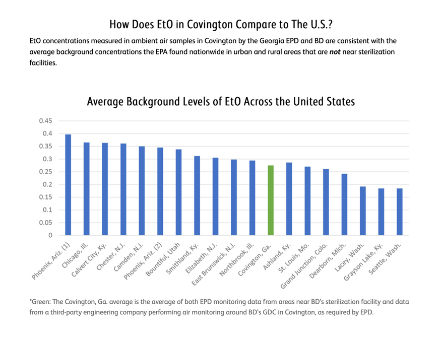 “What the EPD data shows is that the average amounts of EtO in the air in Covington are about the same or below what is found at any other monitoring location in Georgia,” he said, “and is also in line with actual EtO measurements in the air taken by the U.S. Environmental Protection Agency at more than a dozen locations across the country.”