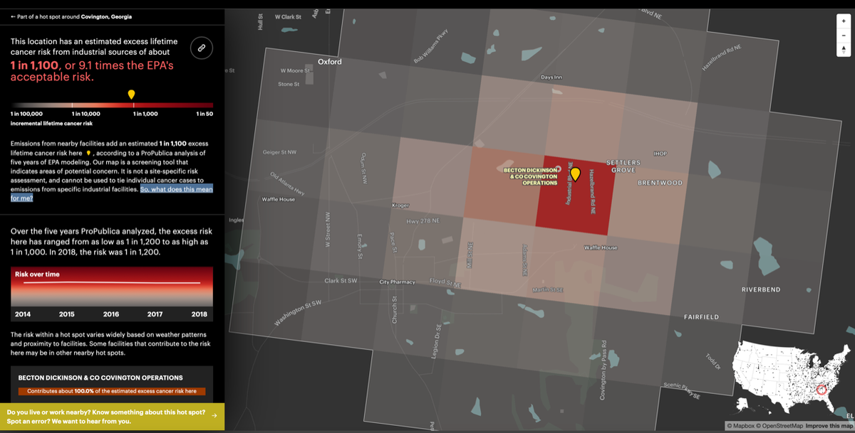 ProPublica did state that its map was “built using data modeled from the EPA’s Toxics Release Inventory, and “because this data is self-reported by the facilities and not always vetted for accuracy by the EPA, we’ve found that it may contain errors.”