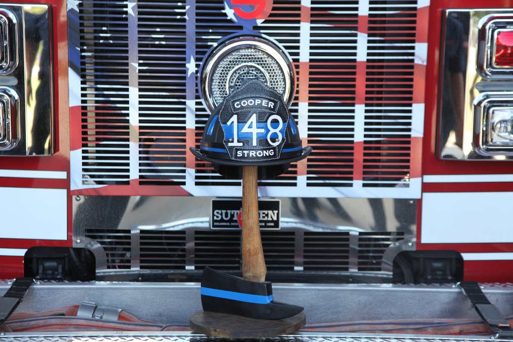 The helmet includes reflective blue tetrahedrons and a shield with Officer Cooper’s badge number and the words “Cooper Strong”. There is a leather helmet band with a thin blue line emblazoned with “Covington Fire”. The helmet sits on a fire ax with another blue line.