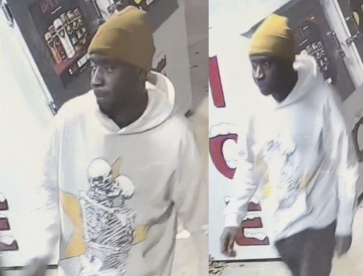 While the BOLO gives no official description, the male in the picture can be described as a Black male wearing a tan colored beanie and a light-tan colored hoodie with two skeletons kissing in the center.