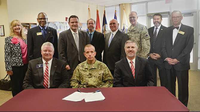 Two college systems recently signed an educational Memorandum of Understanding with Georgia National Guard, Oct. 9, 2015 at Georgia Perimeter College. The agreement will open up “quality educational opportunities for members of the guard and also allow both systems’ military outreach personnel access to National Guard posts across the state,” said Col. Kevin Berkman, director of personnel for the Georgia Army National Guard. From left, standing: Patricia Ross, Director of Military Affairs, Commissioner's Office, Technical College System of Georgia; Dr. Jabari O. Simama, President, Georgia Piedmont Technical College; Dr. David Snow, Director of Military Affairs, University System of Georgia; Todd Brinkley, Education and Incentive Office, Ga. Army National Guard; Tom Bolin, Education Service Specialist, Ga. National Guard; Matt Hanson, Chief Warrant Officer 2, Ga. National Guard; Mark Eister, Director of Military Outreach, Georgia Perimeter College; Rob Watts, Interim President, Georgia Perimeter College. Seated from left: Matt Arthur, Deputy Commissioner, TCSG; Col. Kevin Berkman, Director of Personnel, Ga. National Guard and Houston Davis, USG Vice Chancellor and Chief Academic Officer. (photo by Leita Cowart)