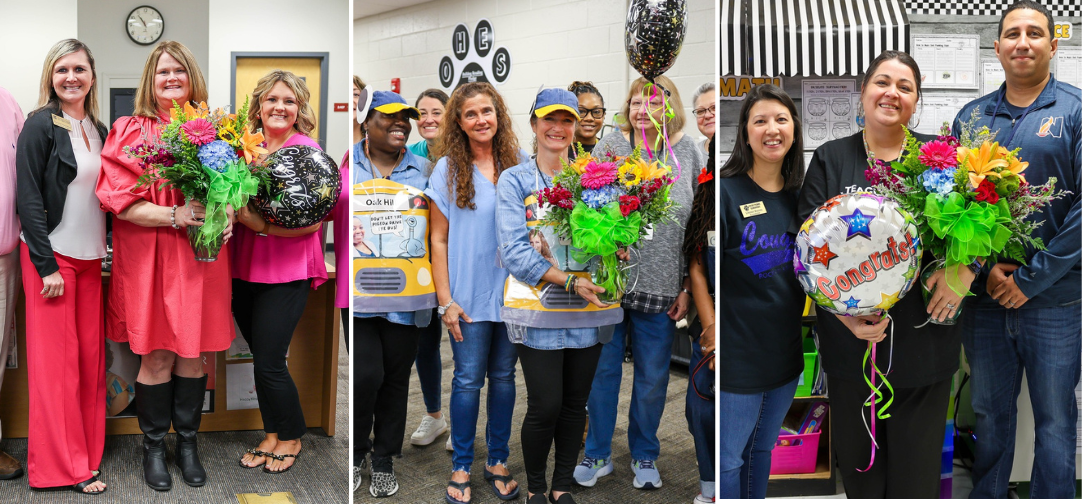 Superintendent Dr. Duke Bradley, Board of Education Chair Abigail Coggin, and district leaders surprised each finalist at their workplace Friday morning to share the exciting news. Family members of the finalists were also invited to take part in the surprise visits, helping celebrate the moment alongside colleagues and school leaders.