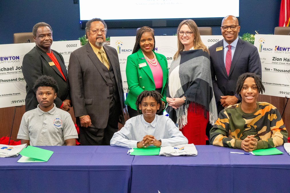 Newton County Schools announced Wednesday that Indian Creek Middle School eighth-grade students Elijah Thompson and Zion Hall, along with Veterans Memorial Middle School eighth-grader Michael Johnson III, have been awarded the "Realizing Educational Achievement Can Happen" (REACH) Scholarship. The recognition was celebrated during a special ceremony at the Newton County Board of Education on Tuesday, Dec. 17, 2024.