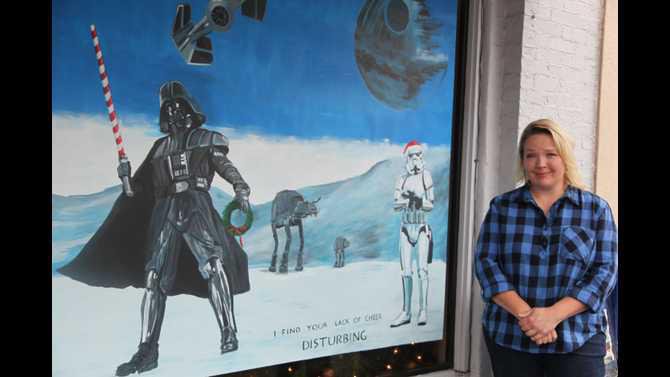 Andrea Smith, owner of Square Perk, wanted Haase to incorporate images referencing some of the events that would be held on the Square over the Christmas season, including figures of the Grinch and Olaf.