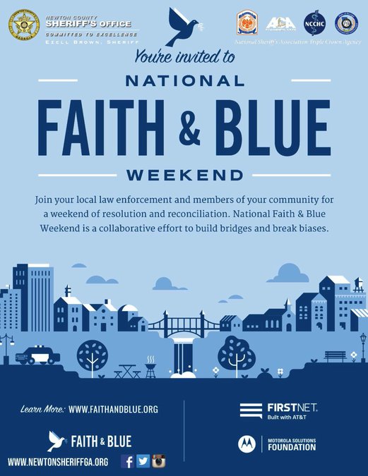 For any questions about the the sheriff's office's participation in this year’s National Faith and Blue Weekend, call Deputy Tim Smith at 770-883-0324 or tsmith@newtonsheriffga.org; or Caitlin Jett at 678-544-6289 or cjett@newtonsheriffga.org.