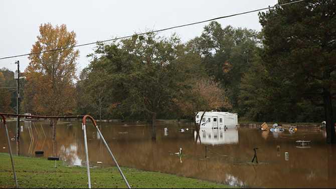 Riverside Mobile Home Park, located off I-20 and Almon Roads, was under water Tuesday, flooding one RV and one mobile home and endangering another mobile home on Sycamore Trail.