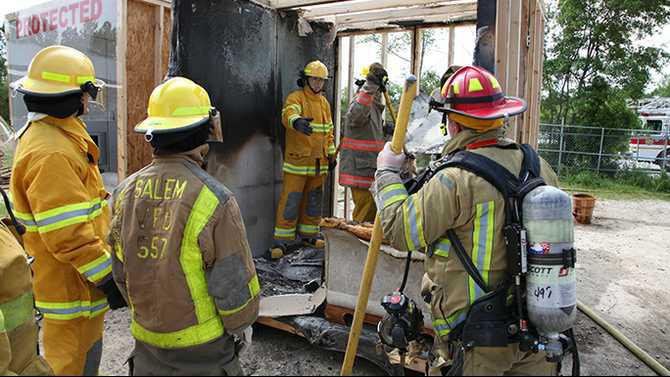 The Covington Fire Department set fires in two small model rooms side by side for a demonstration Friday at the Newton College and Career Academy.