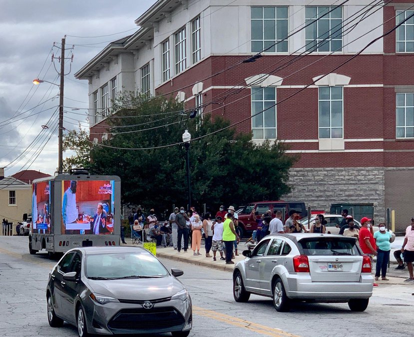 One complaint references a photo — eventually shared on social media — that appears to show a box truck representing Brown’s campaign traveling next to a line of voters on a Pace Street sidewalk near the Newton County Administration Building in downtown Covington Monday, Oct. 12.