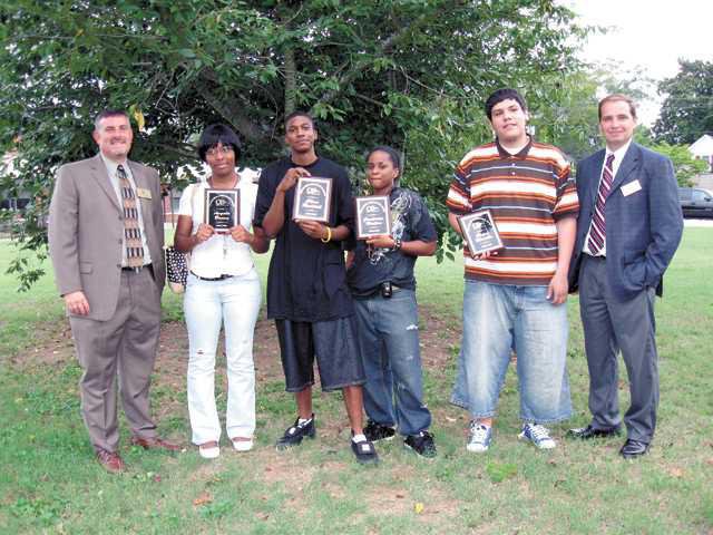 Outstanding achievement at the Open Academy: Students from the Rockdale Open Academy were honored recently at a Board of Education meeting for their achievements in earning credits toward graduation. Left to right: Principal Mike Mauriello, Angela Brown, Chris Reddick, Jordaine Hutton, Cesar Murillo, Assistant Principal Frank Daniels.