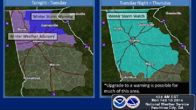 The forecast calls for a wintry mix of freezing rain and sleet of about a quarter to half an inch of ice beginning Tuesday evening across north Georgia and spreading to central Georgia after midnight Tuesday. The freezing rain is expected to continue through Wednesday and end with snow early Thursday morning.