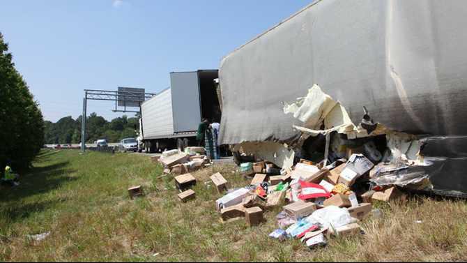 The tractor trailer began to fishtail and flipped on its right side, crashing into the right guard rail and shoulder of the highway.