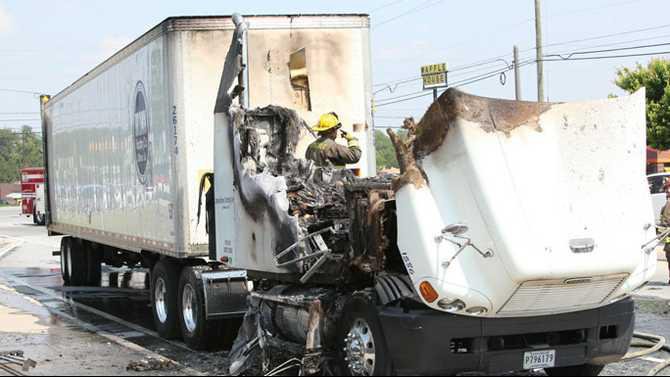 UPDATE (May 12, 4:32 p.m.) The truck has been towed and Ga. Highway 138 westbound is open. -------------------------- (May 12, 4:20 p.m.): The cab of a tractor trailer truck caught fire and burned down on the intersection of Ga. 20 south and Ga. Highway 138, next to the Walgreens and Wells Fargo bank, Thursday around 3 p.m. No one was injured in the fire. Firefighters cut into the trailer, which was filled with Kleenex tissue products, to make sure no sparks or embers were in the trailer portion. The driver said the truck started smoking while he was driving and he when he looked back, he