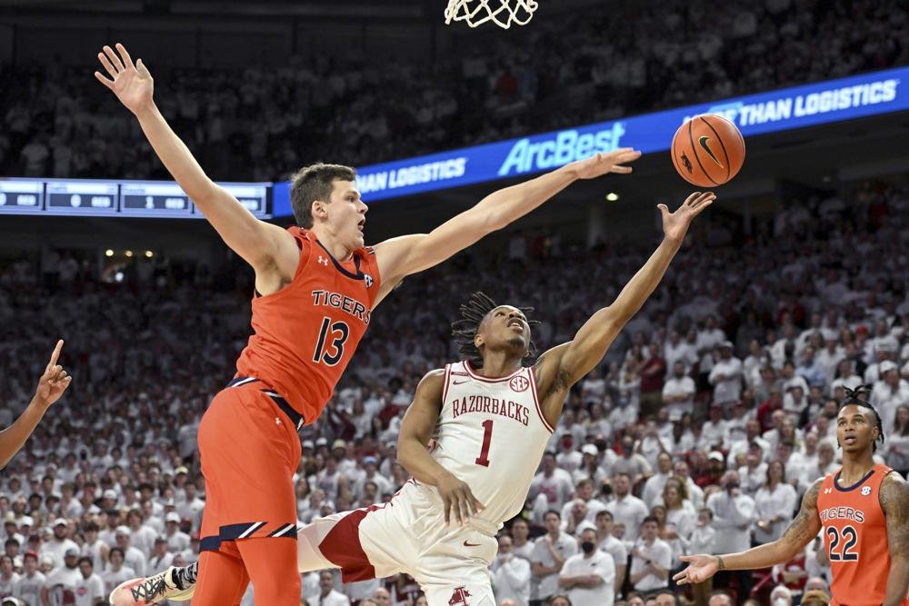 Arkansas guard JD Notae (1) drives past Auburn forward Walker Kessler (13) to score during the first half of an NCAA college basketball game Tuesday, Feb. 8, 2022, in Fayetteville, Ark. (AP Photo/Michael Woods)