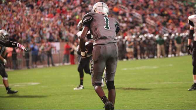 On their first possession the Madison County Red Raiders moved the ball a little, but after two first downs, the offense stalled and Madison punted away. Eastside, starting from their own 20, had two first downs on the drive before Austin Holloway threw a strike to wide receiver Caleb Allen for a 40-yard touchdown with four minutes left in the first quarter. The quarterback went 3-5 on the 80-yard drive. 14-0 Eagles, and the crowd was excited for more.