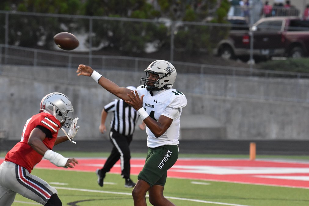 Eastside Head Coach Jay Cawthon stopped the clock with a timeout, and Shaw capped off the Eagles’ drive with a 25-yard touchdown pass to wide receiver Jace Taylor, giving Eastside a 28-7 lead at the half.