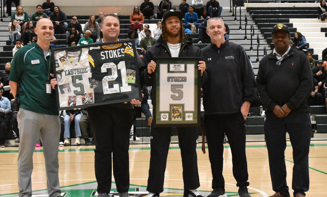 In front of over 1,000 fans, teachers and supporters, Stokes’ No. 5 football jersey was retired by the Eastside Eagles during halftime of Friday’s basketball contest between the Eagles and the Walnut Grove Warriors. It marked just the second time that Eastside has retired a jersey in its program history, with the first being fellow NFL veteran Sheldon Rankins back in 2017.