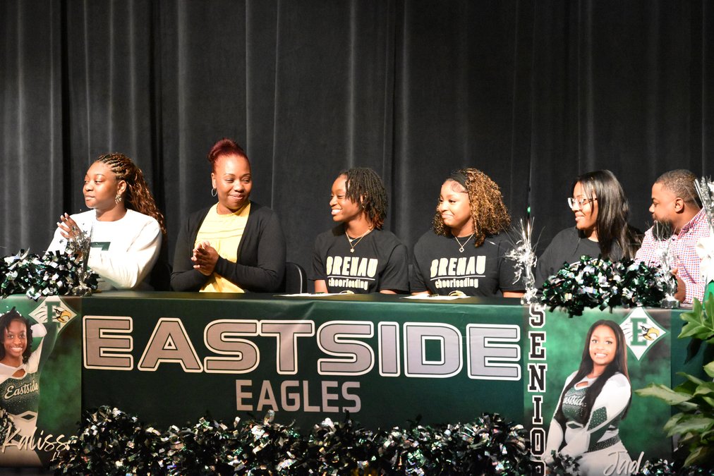 Several students gathered in the Eastside auditorium Wednesday morning for the signings of Kalissa Hunter and Jadyn Moon, who are set to become cheerleaders at Brenau University.