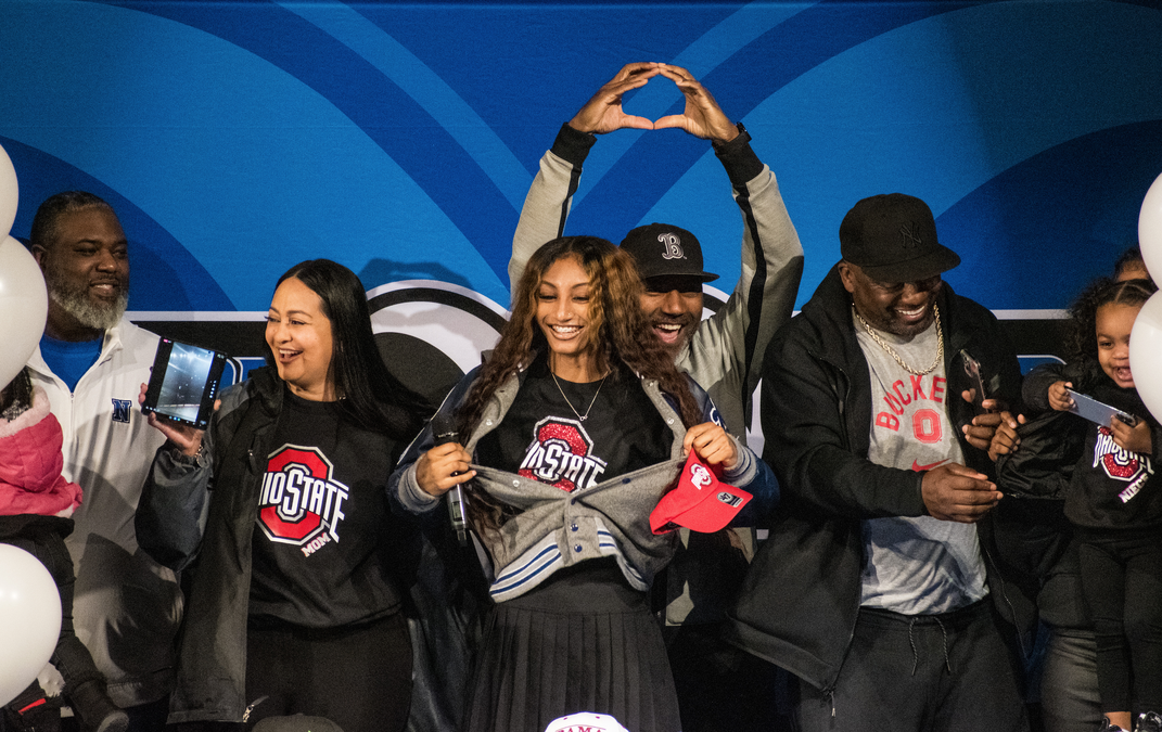 The choice came down to Ohio State, Alabama and South Florida with each school represented with a cap on the table. Hagans initially picked up the Alabama cap before setting it aside to grab the Ohio State hat to cement her signing as a Buckeye.